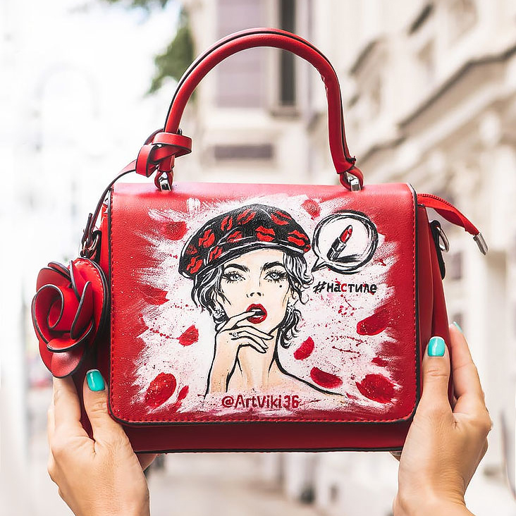 Leather Mini Tote Bag with Rose and Girl Print in Red